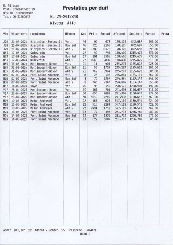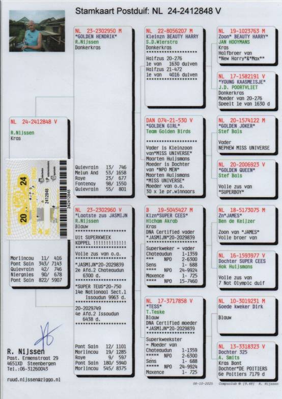 RUUD NIJSSEN a Dutch breeder known for his very good results in the Marathon and also for the other tipe of races. Offers for sale, 10 pigeons from the Marathon category, through BidPigeon. The auction starts on 22-10-2021 at 20:00 and closes on 05-11-2021 at 21:00. He started competing with pigeons at the age of 18, so today he can be proud of a 38-year experience in the pigeon field. His pigeons have brought him countless results over the years and continue to this day. So: