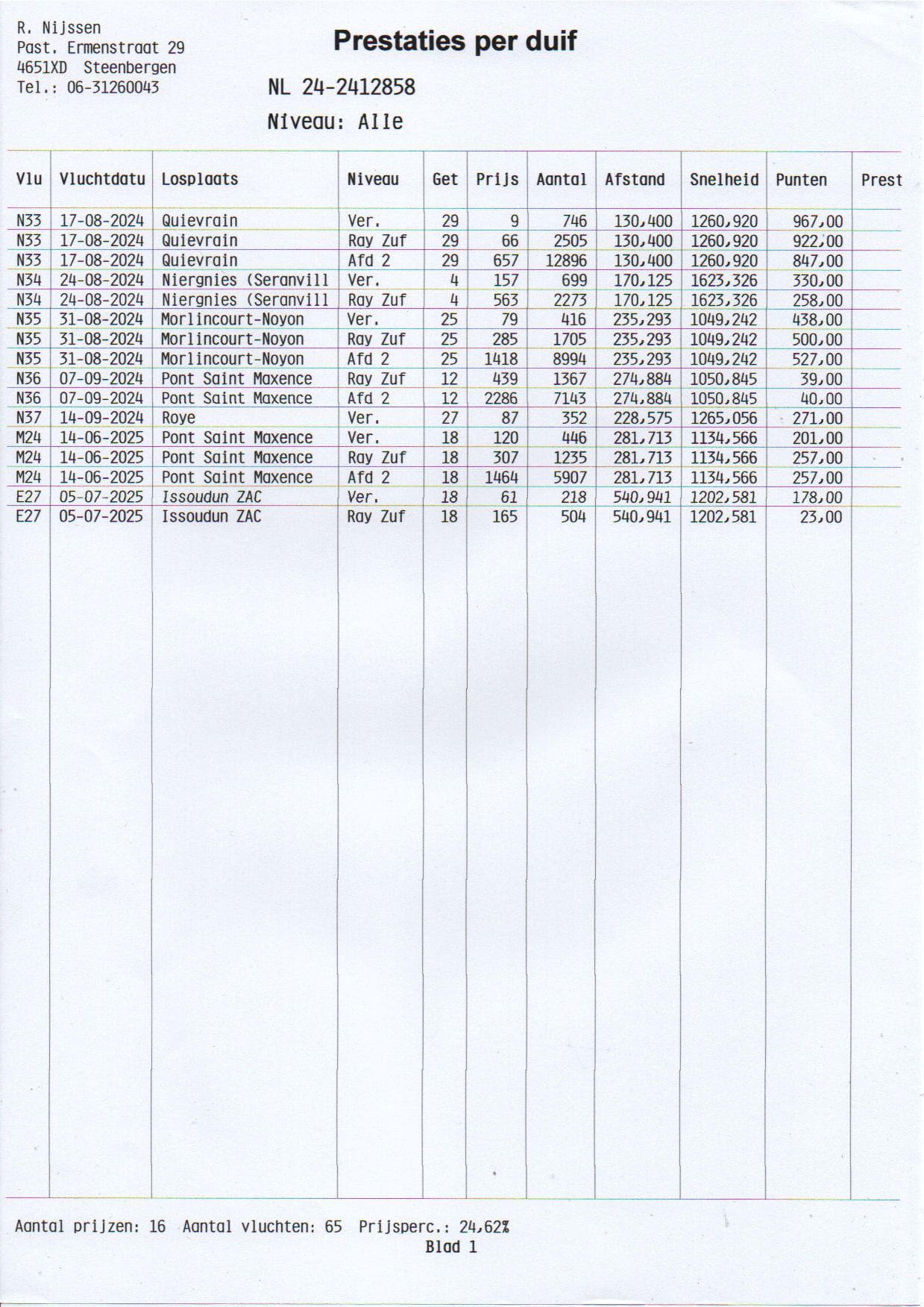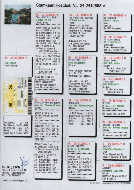 RUUD NIJSSEN a Dutch breeder known for his very good results in the Marathon and also for the other tipe of races. Offers for sale, 10 pigeons from the Marathon category, through BidPigeon. The auction starts on 22-10-2021 at 20:00 and closes on 05-11-2021 at 21:00. He started competing with pigeons at the age of 18, so today he can be proud of a 38-year experience in the pigeon field. His pigeons have brought him countless results over the years and continue to this day. So: