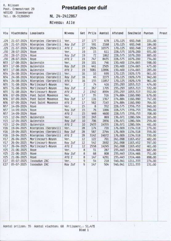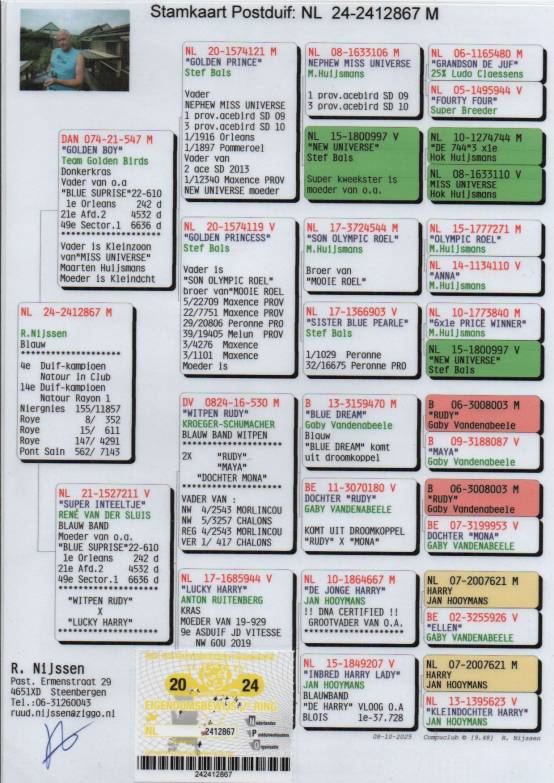 RUUD NIJSSEN a Dutch breeder known for his very good results in the Marathon and also for the other tipe of races. Offers for sale, 10 pigeons from the Marathon category, through BidPigeon. The auction starts on 22-10-2021 at 20:00 and closes on 05-11-2021 at 21:00. He started competing with pigeons at the age of 18, so today he can be proud of a 38-year experience in the pigeon field. His pigeons have brought him countless results over the years and continue to this day. So: