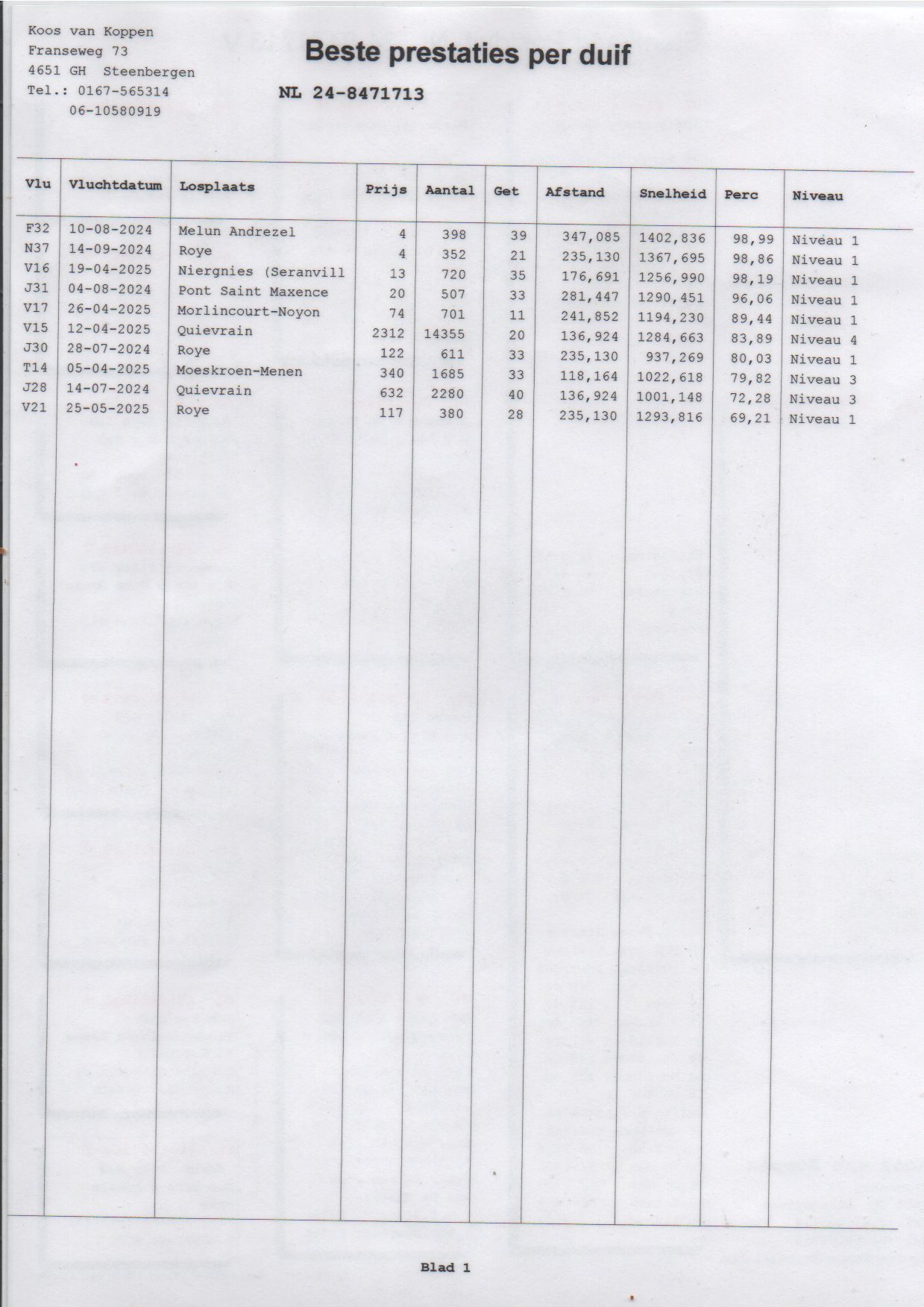 Koos van Koppen s-a stabilit cu multi ani in urma in Seenbergen. In anul 1982 a inceput sa participe la cursele cu porumbei.