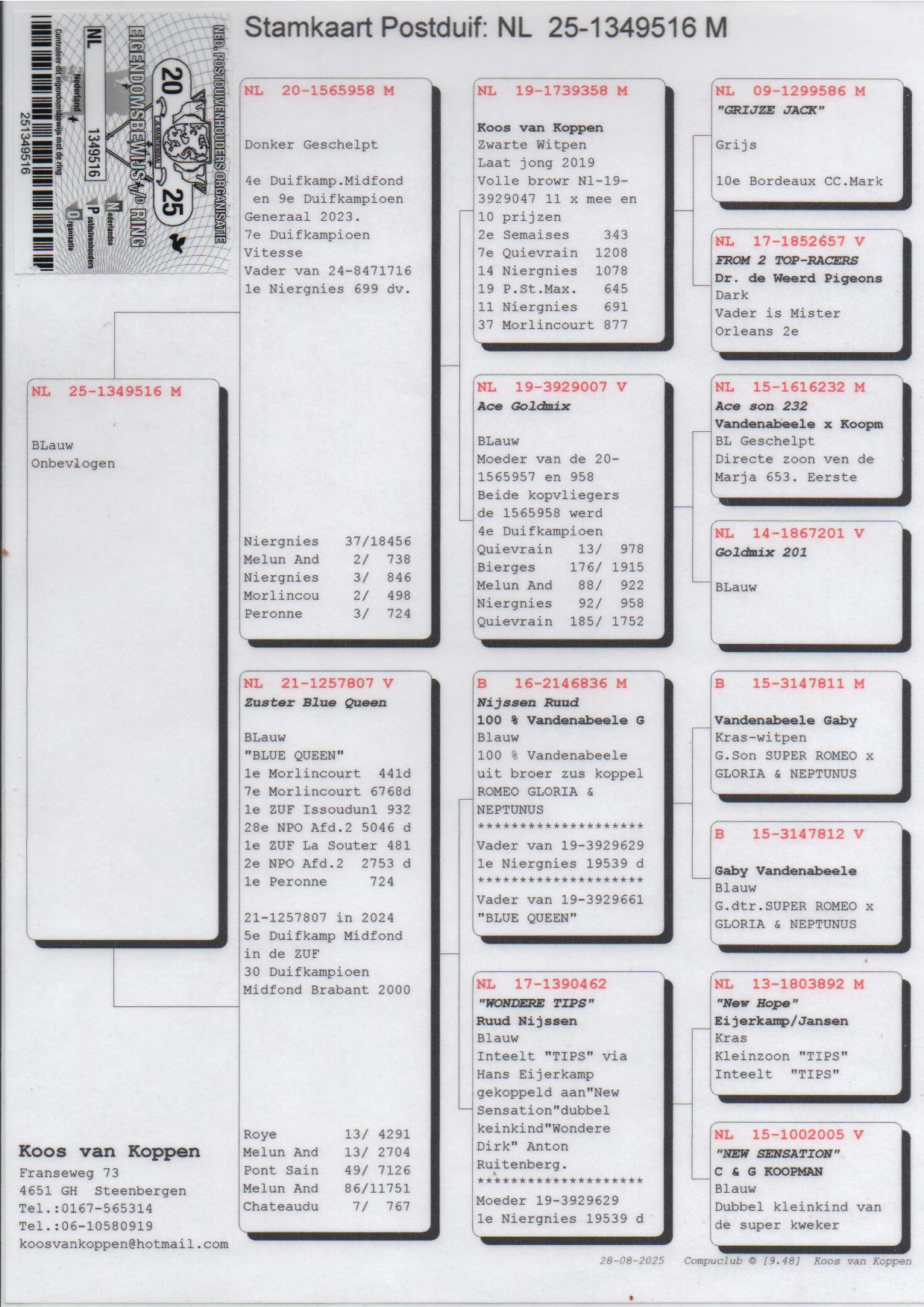 Koos van Koppen s-a stabilit cu multi ani in urma in Seenbergen. In anul 1982 a inceput sa participe la cursele cu porumbei.